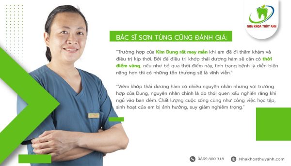 Đó là toàn bộ những chia sẻ của Kim Dung khi kết thúc quá trình điều trị TMD trong vòng 6 tháng tại Nha Khoa Thuỳ Anh. Kim Dung đã điều trị và khỏi thành công. Hãy liên hệ ngay với chúng tôi nếu như các bạn cũng gặp phải tình trạng này nhé!