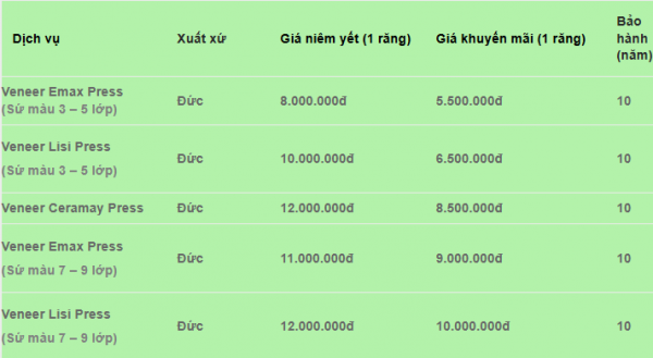 Tại Nha khoa Thùy Anh, bảng giá dán sứ veneer được công khai minh bạch như sau: