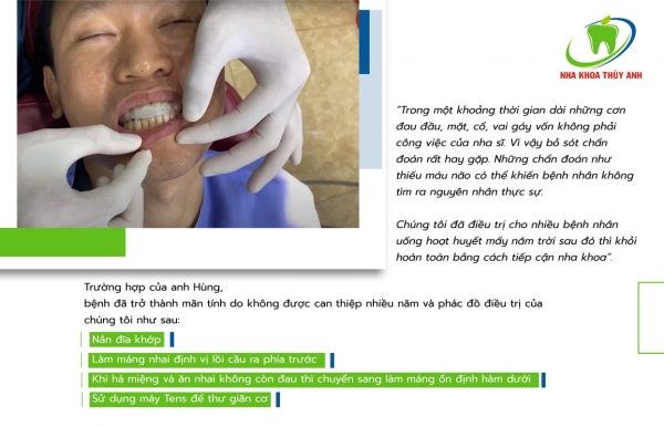 Trước đây khi khớp hàm của anh chưa bị đau nhức, bạn bè cũng có nhận xét rằng gương mặt và môi của anh bị lệch. Anh cũng không nghĩ ngợi gì nhiều lắm, sau này khi hàm bị đau rồi, bản thân anh cũng chủ quan và nghĩ rằng tình trạng này chỉ là đau bình thường: “không nghĩ rằng mình sẽ mắc phải bệnh lý này bởi những thông tin về bệnh khá là ít”. Vì vậy anh chỉ sử dụng thuốc giảm đau thôi. Tuy nhiên thuốc giảm đau chỉ giảm được cơn đau lúc đó, ngày hôm sau anh lại bị những cơn đau dày vò. Cho tới khi miệng của anh không há được, nuốt nước bọt cũng thấy đau, lúc này anh mới lên các trang mạng tìm hiểu về triệu chứng mà mình gặp phải và biết tới Nha Khoa Thuỳ Anh Hà Nội.